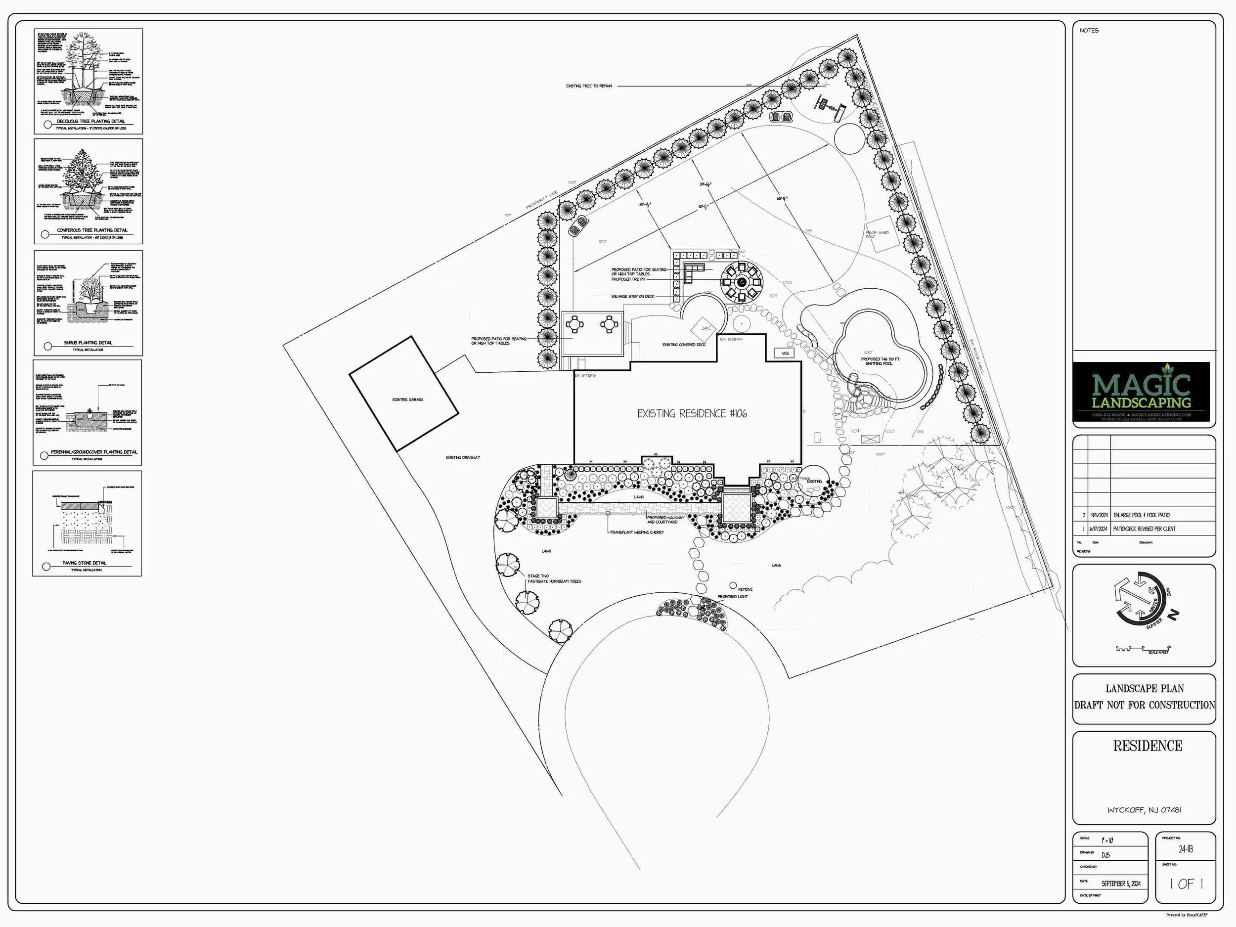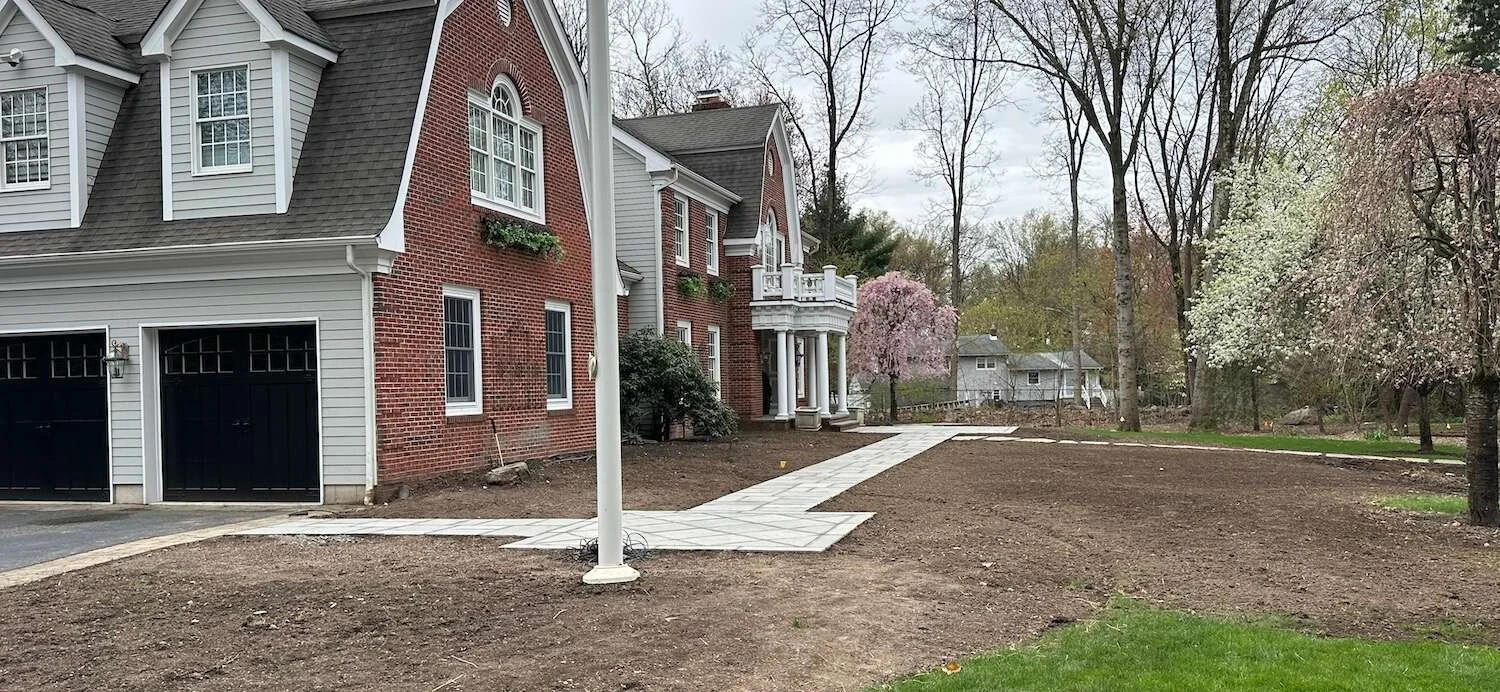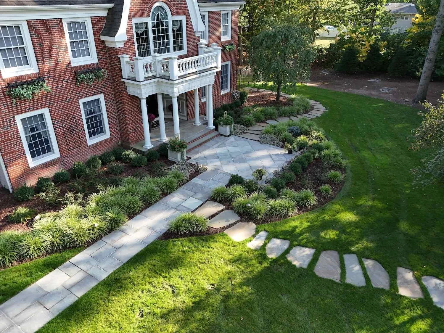 This stunning front entrance transformation in Wyckoff, NJ, creates a grand yet inviting approach to the home. The existing paver walkway had become worn and no longer complemented the home’s classic architecture. To restore elegance and functionality, we designed a formal entry walkway using Unilock geometric natural stone in Stone Cliff Grey, seamlessly tying into the home’s traditional aesthetic. A parquet and random geometric pattern adds visual interest, while subtle, natural pathways extend toward the street, offering a welcoming transition through the landscape. Thoughtfully integrated pathway lighting enhances safety and ambiance, making the entrance as beautiful at night as it is during the day.
