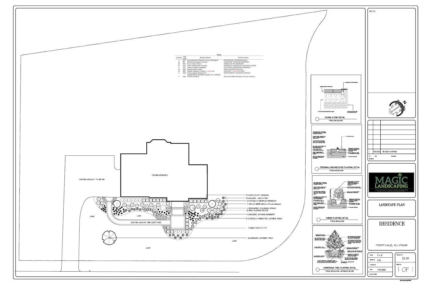 Unilock Arcana Courtyard, Bluestone Border, Clay Brick Walkway, Running Bond and French Parquet Patterns, Limestone Accents, Foundation Plantings