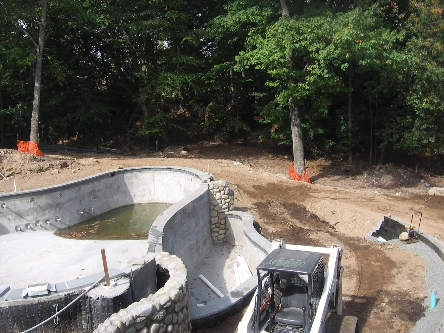 Riverstone Retaining Walls, Sculpted Bluestone Staircases, Vanishing Edge Pool, Lower Soaking Pool, Brick Patio Terrace, Multi-Tiered Terraces, Outdoor Living Rooms, Lakefront Views, Natural Plantings, Grade Resolution