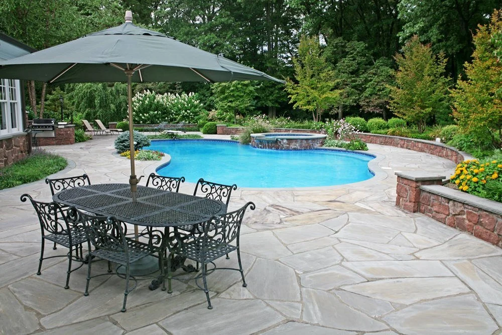 The existing grade presented a dramatic drop between the house and pond, making the yard feel inaccessible and fragmented. Instead of fighting it, Magic used the elevation as inspiration: terracing the slope into elegant platforms connected by riverstone walls and bluestone stairs.