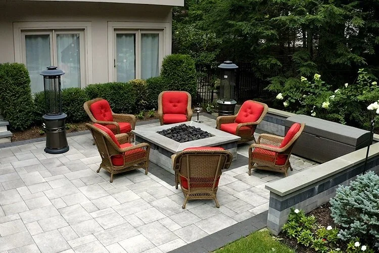 Tiered Transitions in Stone: Multi-level bluestone patios and robust fieldstone retaining walls manage grade changes with elegance, while inviting movement throughout the site.