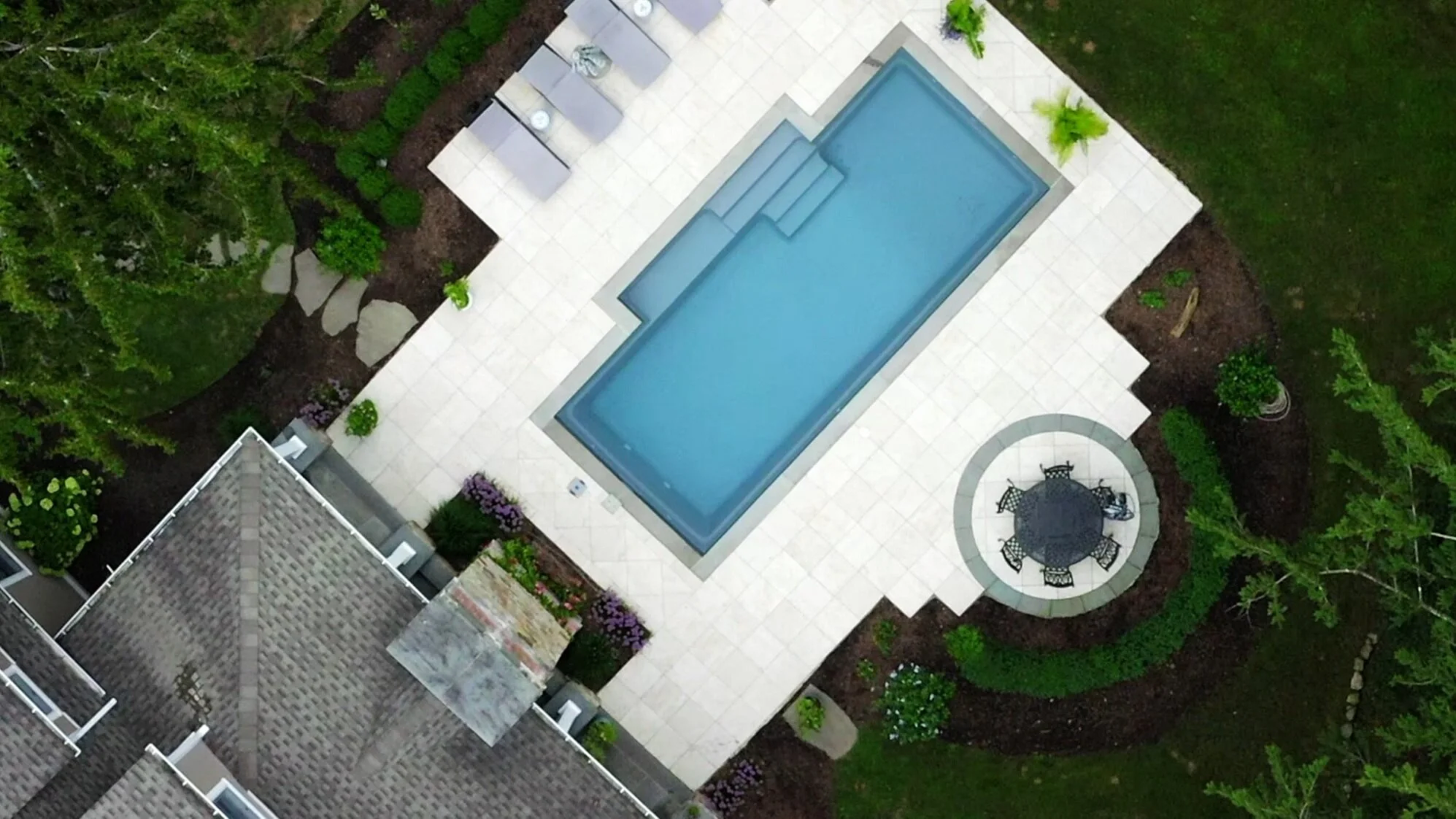 Fiberglass Pool, Bluestone Coping, Porcelain Patio, Curved Lounge Area, Circular Dining Niche, Centered Focal Design, Tiered Elevation