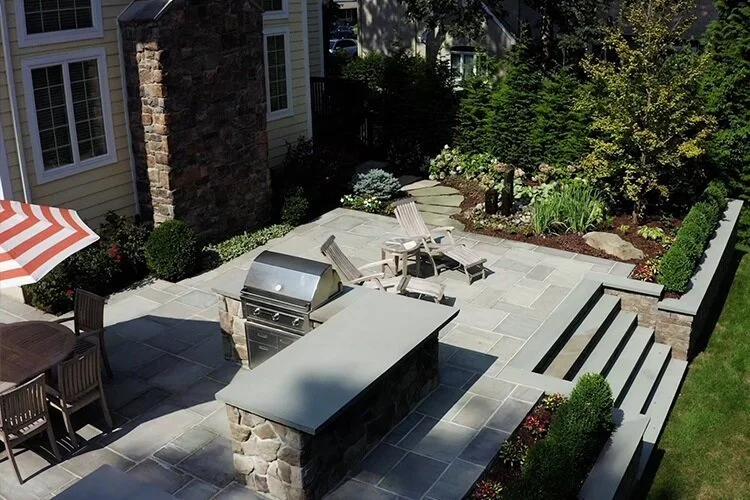 Natural Bluestone Coping & Detailing: Bluestone coping adds timeless contrast to the modern porcelain decking and repeats in the circular dining zone for visual cohesion.
